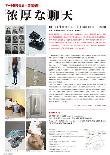 との交流促進を目的として、中国の若手アーティストや中国とかかわりを持つ日本のアーティストの作品展示を行います。タイトルの浓厚な聊天 とは、”濃厚なおしゃべり””という意味です。